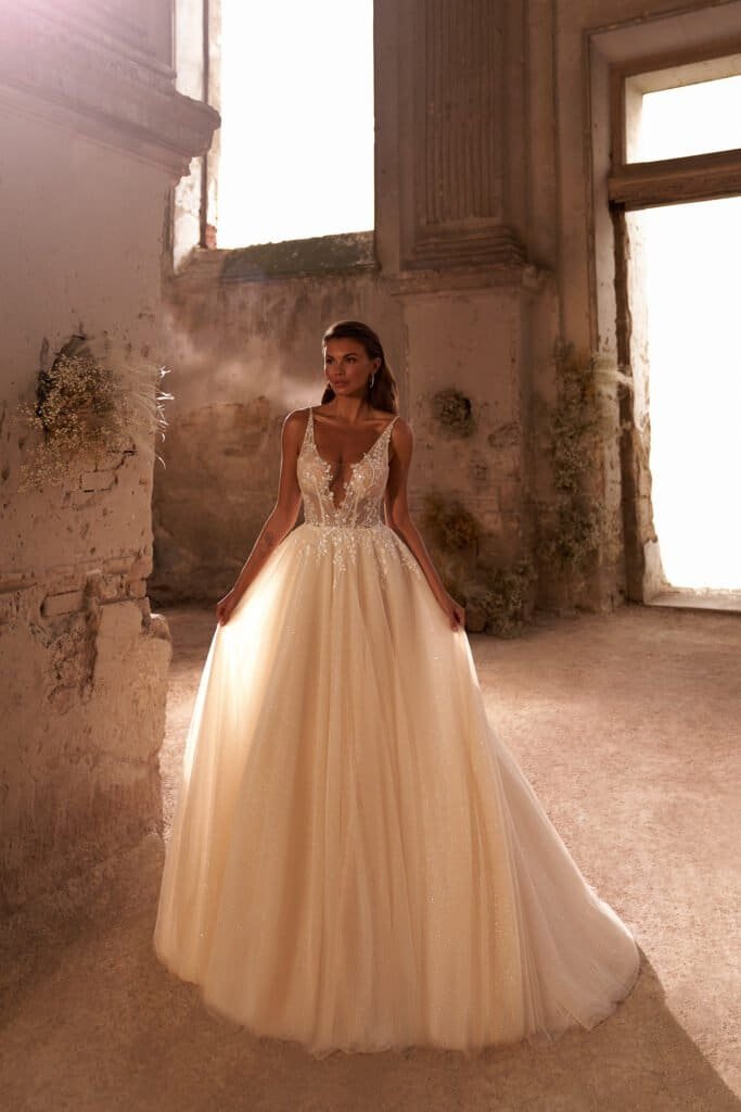 - Karcsú vagy homokóra testalkatú menyasszonyok: Kiemeled a derékvonalat és mesés, arányos formát kölcsönöz a sziluettednek.